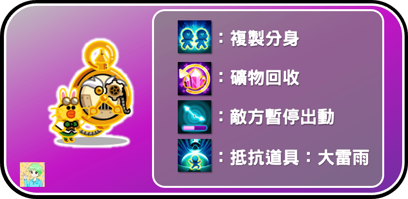 老爺懷錶白兔莎莉於2022年9月開放進化至九星,上圖是他九星的四種能力,不得不說這個組合非常強,四個選項中僅有礦物回收比較沒用,複製分身可以增加礙產效果,停產也是輔助礙產,剛剛兩者都是玩礙產的玩家很推的能力,抵抗大雷雨也不差,可以在PvP中突襲他人,變成另類的高中生兔兔,不過礙於他屬於特殊的光暗寵(滿等在生產時間為5.5秒),建議可以180等再進化。