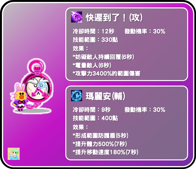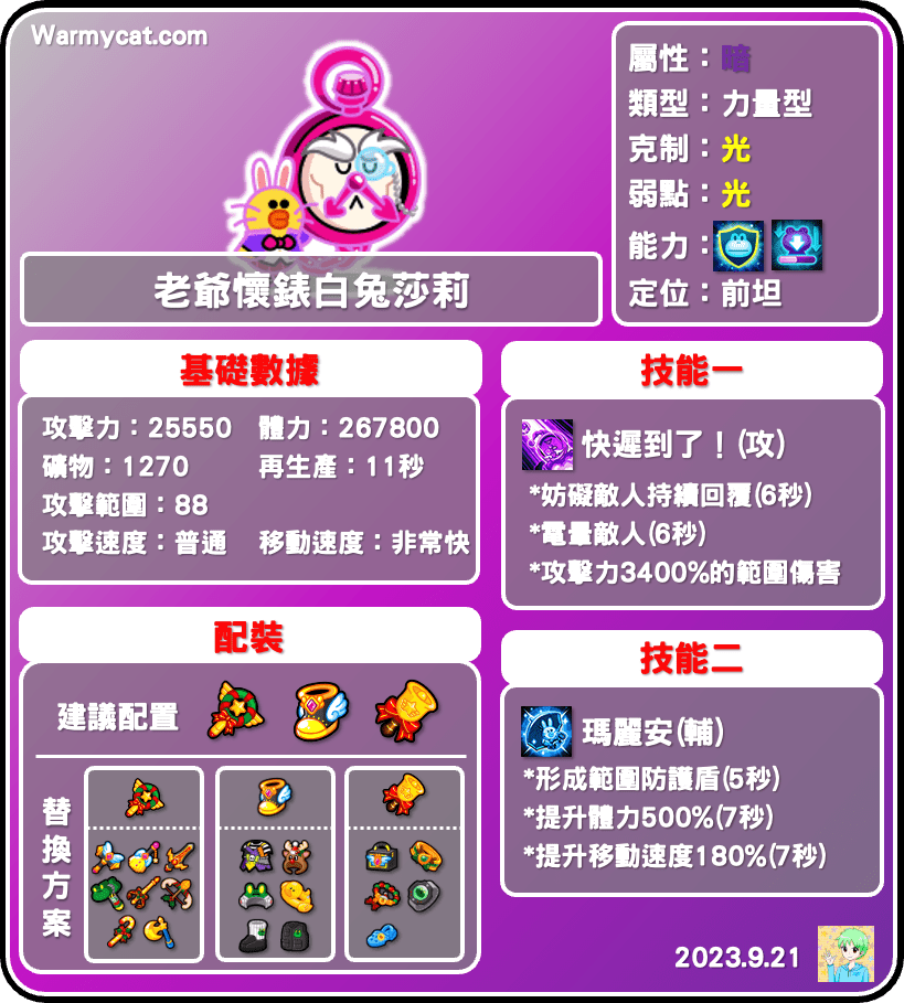 老爺懷錶白兔莎莉是目前暗寵陸軍中,少數被看好的角色,也是目前少數「相對」比較不會被光寵打壓的Rangers,不要小看它僅有26萬多的體力,在PvP中遇到可不會給你「很軟」的感覺,這是因為他的二技能輔助招中可以提升體力高達500%!與魔術師熊大並列為全遊戲中最高的倍體數值,除此之外還可以給予我方防護盾,有效保護我方前線;最後還有一項提升移動速度180%,數值也僅落後音速小子的190%,提升跑速有助於我方在PvP的開場卡位,讓我方有較佳的站位優勢,也可以在跑跑活動中有更好的成績!是一隻PvP、跑跑活動都很強勢的Rangers。