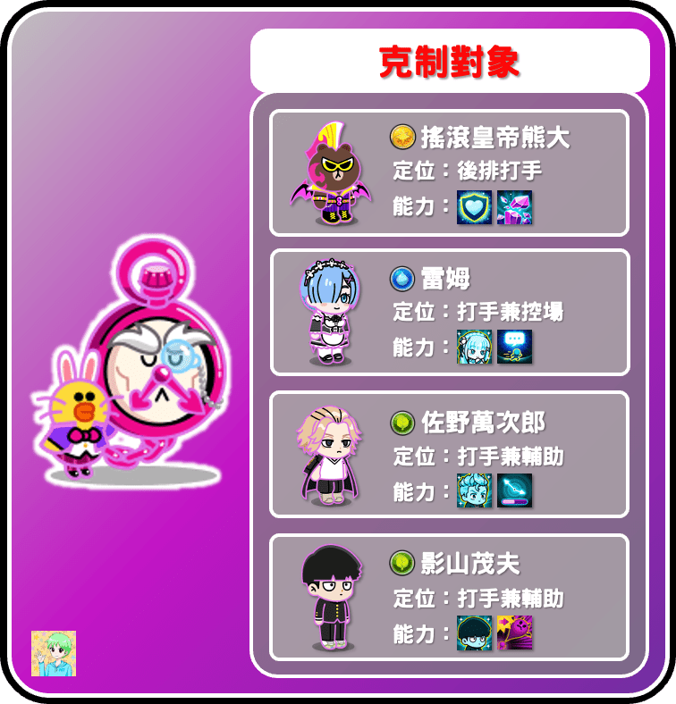 基本上老爺懷錶白兔莎莉就算叫出光系打手,也不見得可以壓制,例如很強勢的光系打手「主唱熊大」,除此之外還有一些常見的水火木打手,其中要特別提一下的是雷姆,基本上雷姆也不容易打死鐘錶莎莉,但雷姆可以透過「後移」來牽制鐘錶莎莉,也是這四隻克制對象中相對容易對付鐘錶莎莉的打手。