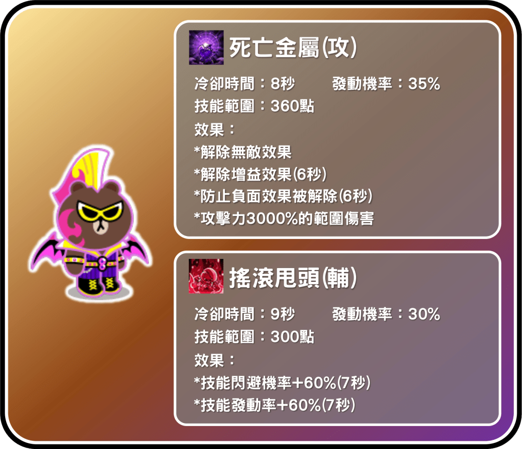搖滾皇帝熊大的一技能是有傷害的攻擊招,有最基本的解除無敵以及3000%高傷害外,還可以解除敵軍增益長達6秒,還有一項較為罕見的效果-防止負面效果被解除,可以防止敵軍解除降低技能閃避機率、降低攻擊力…等效果(不包含電暈、變身),讓我方可以更容易將傷害命中對方,這項技能蠻針對敵軍後排的,相對容易打擊站位遠的角色,若能配合影山茂夫的輔助,則可以有極為出色的表現。