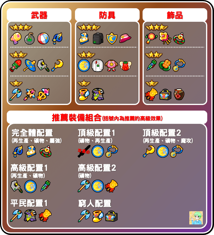 圖片上半部是推薦能使用的裝備,其中推薦的屬性裝備皆為跑跑裝備,取得方式僅有於活動關卡積分排名到達前100名(八星裝備為前50、30名),目前完全適用的減產必中僅有八星的新年青龍鞭,沒有完全匹配的七星減產必中可用,第四項優先建議選擇減少礦物。