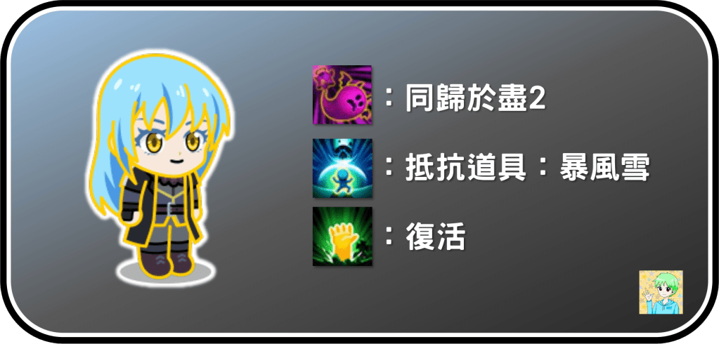 魔王利姆路可以九星進化,他的能力跟範馬刃牙合作的一二獎相同,都是同命+抗冰+復活的組合,除了同命較無用以外,其他兩者都是很不錯的能力,抵抗暴風雪在PvP是很厲害的能力,有抵抗風冰莎的功用,復活則是在公會戰中可以大幅增加存活率,以確保我方場上的人數。