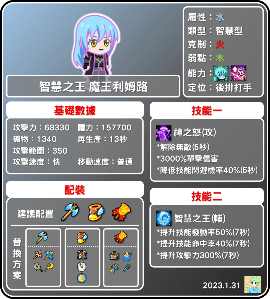 魔王利姆路是水系的後排智慧型打手,攻擊力部分與其他近期強勢智慧寵相比顯得略低一些(愛蜜莉雅7.9萬、主唱7.2萬、剎那7.1萬、攝影部長跟波賽頓6.9萬),相對有點可惜,站位350算中偏遠的安全站位,體力15.7萬也不算低,礦物1340也算是蠻親民的,能力部分除了有合作小隊,還有增礦2,是在PvP防禦中很厲害的能力之一!