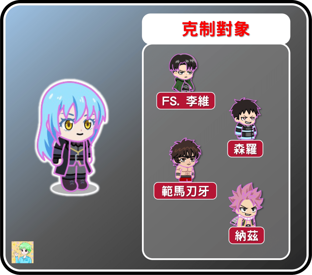身為水系打手的魔身王利姆路,用途明顯就是來針對常見的火寵,唯一要提及的只有森羅,由於森羅被打倒後有高機率會發動毅力7秒,可能會有卡戰線的情況發生,但通常不會改變整體對戰情況太多。