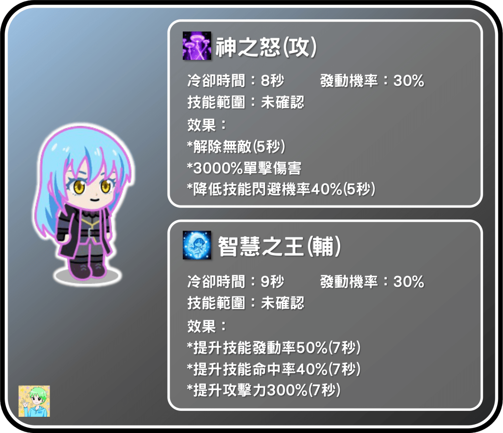 魔王利姆路雖然數值不及其他目前的強勢打手,但其實他的傷害也不算太低唷!若沒有其他打手的玩家是可以抽一隻來使用的,但如果已經有其他更強的打手,則可以考慮跳過利姆路,將卷留給三月的九週年光暗寵!