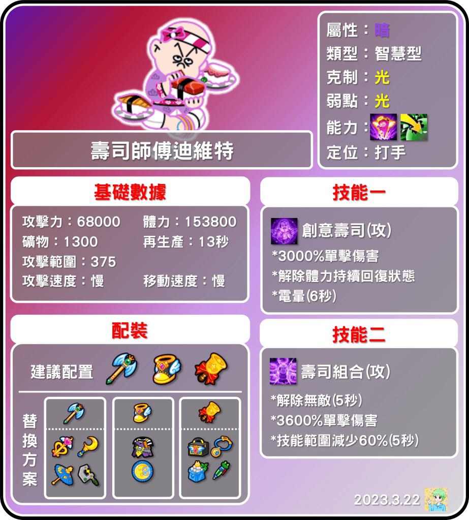 壽司師傅迪維特是一個雙面刃,個人認為是大佬的玩具,平民不太容易駕馭的角色,關鍵就是裝備的「屬性強化」,這項能力才有辦法讓迪維特好好發揮,然而暗系的屬性強化只有跑跑裝才可以獲得,因此才會說不適合平民,要抽他的玩家建議思考一下裝備是否能夠支撐唷!