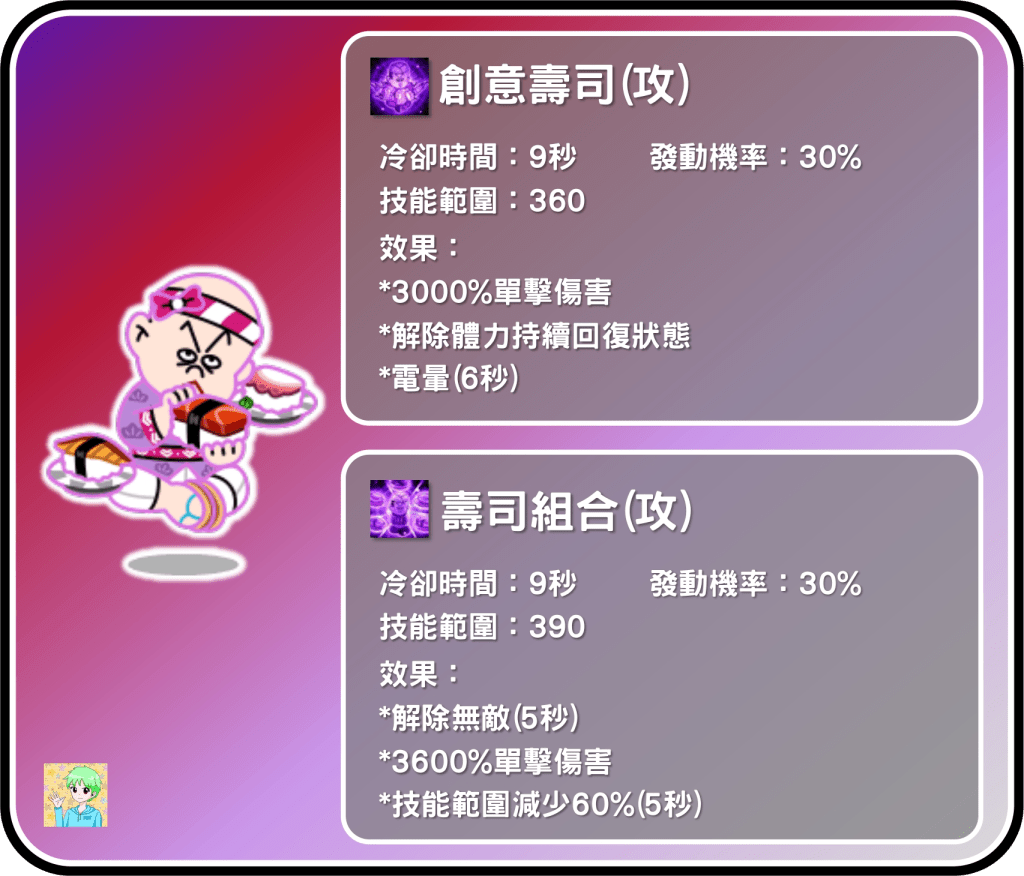 壽司師傅迪維特的一技能是有傷害控場攻擊招,可以電暈敵人6秒、解除回血跟30倍傷害,傷害量算是很足,可惜不能解除無敵,效果就相對不明顯。