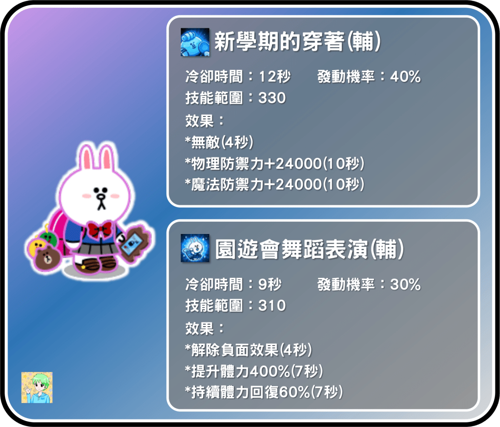 高中生兔兔的一技能是輔助招,看點是給予我方範圍無敵,可以保護前排,但可惜提升防禦力的時長太長,導致冷卻時間高達12秒!因此若沒疊起來,無敵效果可能會不密集,要多多注意