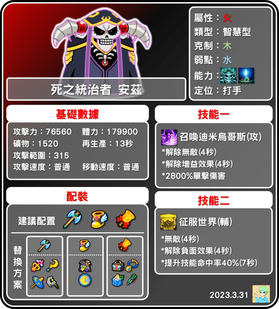 死之統治者安茲是火屬性智慧型,是時隔兩年的合作新火智寵大獎(上次是小葵),定位是打手,攻擊力高達7.6萬,傷害比主唱熊大還來的高(主唱熊大攻擊力7.2萬),體力也逼近18萬,算是蠻高的數值,能力部分除了小隊以外,還有久違的出動能力,安茲的出動能力是針對力量型的電暈,與愛蜜莉雅非常相似。