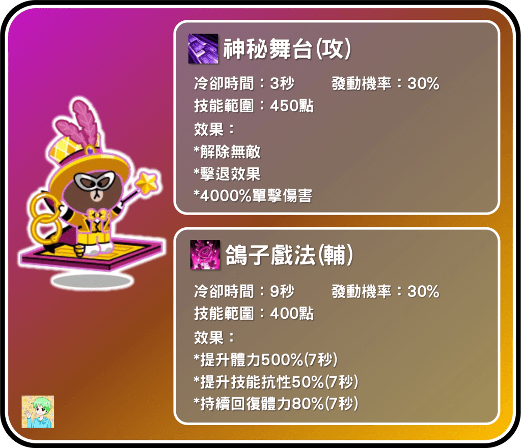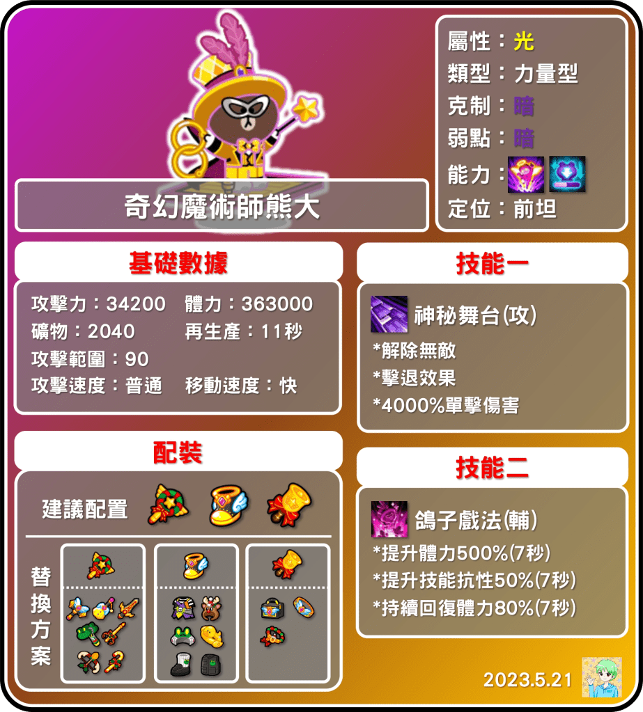 魔術師熊大可以說是阿努比斯熊大的上位版,論傷害、坦度以及技能,個人認為每一項都超越阿努比斯熊大,只可惜的就是礦物量的問題,導致魔術師熊大不適合讓新手使用,因此這次的光復刻扭蛋中,會比較推薦新手去抽阿努比斯、老手去抽魔術師熊大,魔術師熊大的強度,絕對是後期玩家一定要練起來於隊伍中使用的!
