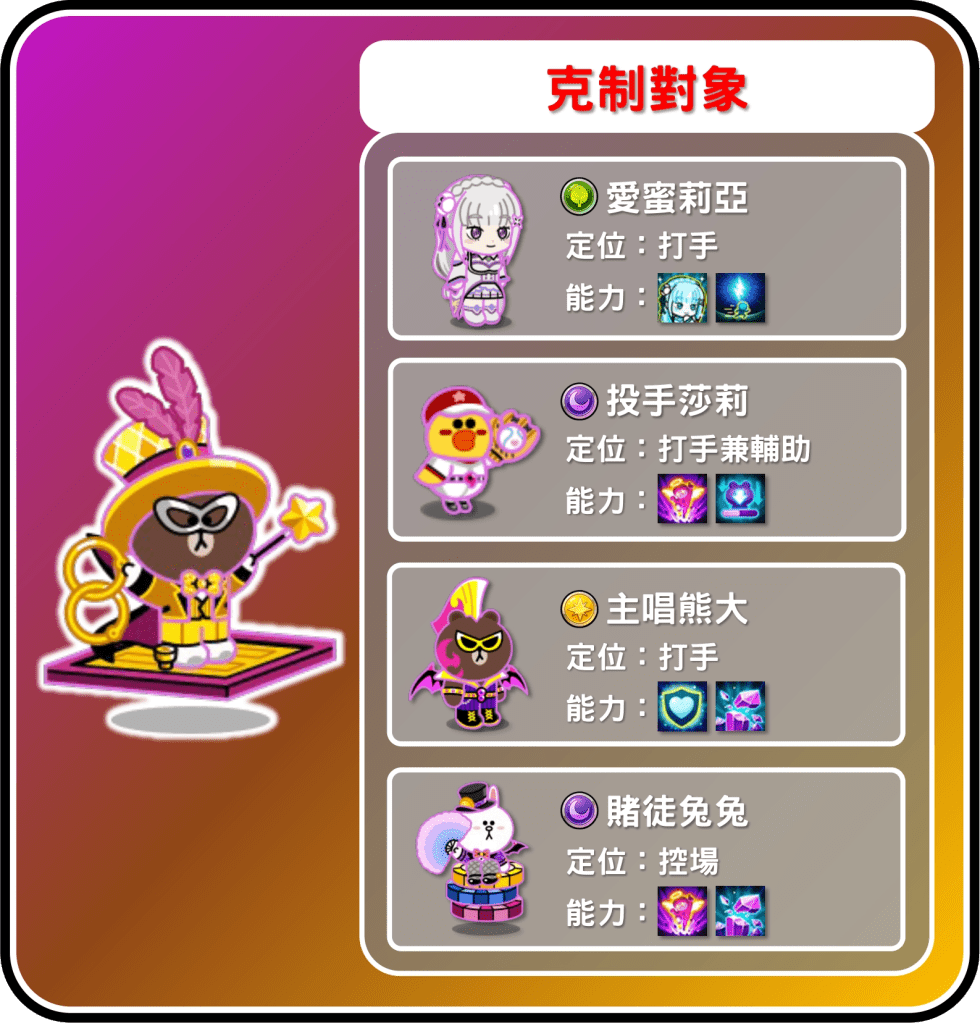 與阿努比斯熊大不同之處,就是阿努比斯熊大偏向干擾型的卡位坦克,魔術師熊大則是偏向控場型的坦克,因此擁有超大範圍的攻擊技能,魔術師熊大可以針對不少「以站位為傲」的角色,首先就是站位高達410點的愛蜜莉亞,魔術師熊大是目前環境中少數可以直接傷害到愛蜜莉亞的角色。再來是主唱熊大及賭徒兔兔,只是賭徒兔兔也是有可能反向將魔術師熊大暈死,需要特別注意,最後再舉一個目前常見的暗打手-投手莎莉,由於投手莎莉無法解除無敵,加上魔術師熊大超強的輔助技能,會使投手莎莉的傷害不明顯。