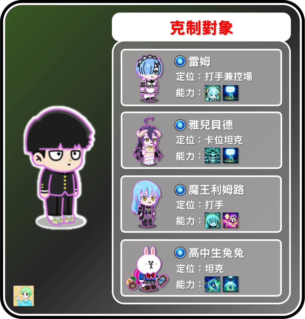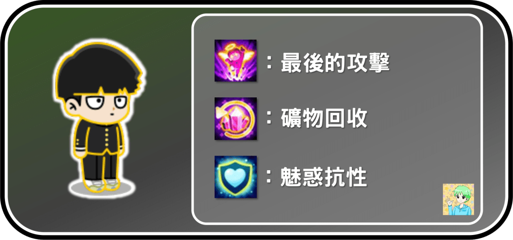 影山茂夫進化至九星之後可以隨機獲得以上的一項能力,個人認為三項能力對於影山茂夫來說都不好用,由於站位極遠,因此不容易觸發最後的攻擊以及礦物回收,魅惑抗性也不怎麼有用途,因為魅惑寵在目前環境都不強勢,而且也沒有大範圍的魅惑寵,只能說這位大獎的九星能力都只是裝飾。