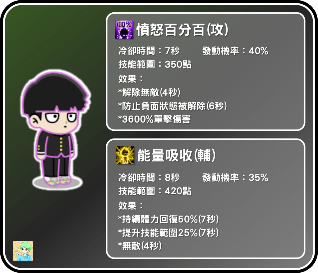 影山茂夫的一技能是有傷害攻擊招,可以發現內容跟主唱熊大有點類似,都可以解除無敵+防止負面狀態被解除,整體來說是很不錯的,可以說是平民版的搖滾熊大。