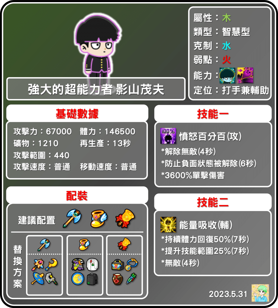 影山茂夫是木屬性智慧型,定位是後排打手兼輔助,攻擊力6.7萬、體力14.6萬都不算太頂尖,但是他的站位高達440點!比愛蜜莉亞的410點還高,是一個極度優秀的站位,礦物量1210,算中偏低的礦物,很適合新手使用,能力除了小隊以外,還有一項新能力「出動暗殺」,初判是同歸於盡的加強版,效果不會太好,有待實測後再評論。