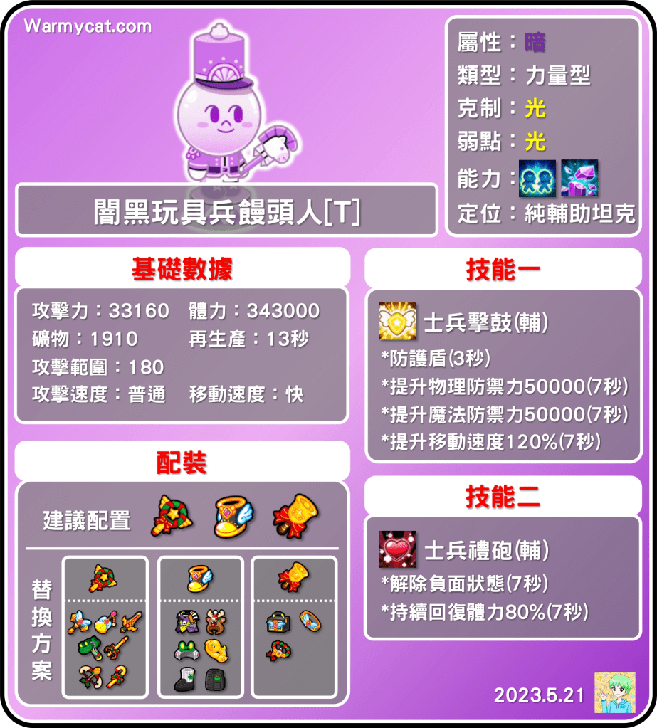 闇黑玩具兵饅頭人是暗屬性力量型,由於是樂隊饅頭人的再製版,因此定位依然是純輔助。體力部分高達34.3萬,整體來說算高的,但若以nft系列來看就算偏低,礦物量不怎麼意外的還是很高,超進化就高達1910,減礦裝備一定是需要的。站位180點,以坦克來說有點太遠,屬於副坦的站位,不宜直接作為主坦使用。能力部分則將面罩改為分身,並且保留原先的妨礙礦物生產,是礙礦成員之一,不過分身可以提高堆寵速度,因此能力部分提升了不少。