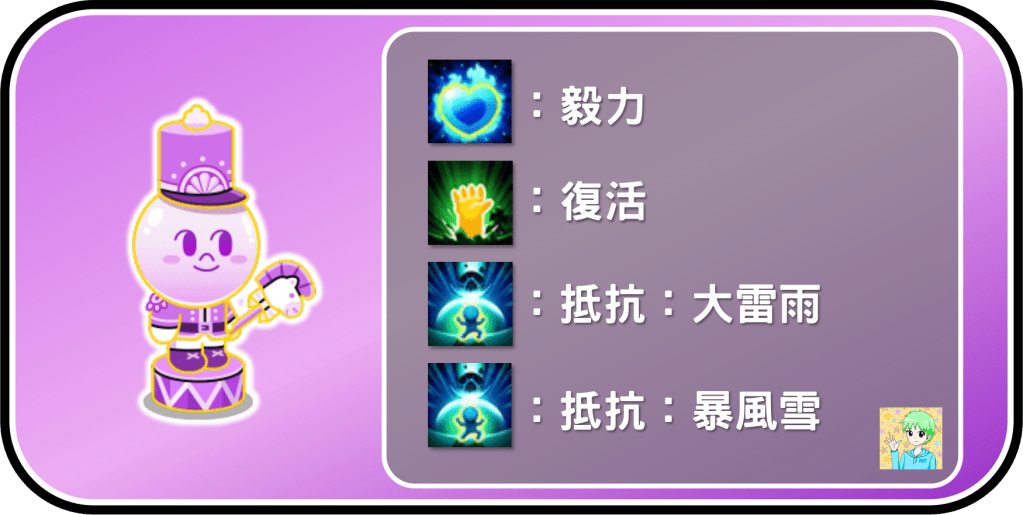 九星的玩具兵饅頭人有四種第三能力的可能性,他四個能力其實都蠻不錯的,可以說是各有用途,首先是毅力跟復活,這兩者都是用於公會戰跟PvP,毅力在公會戰有拖延時間的功效、PvP可以配合飛寵做使用;復活在公會戰可以有第二條命、PvP可以增加在場上輔助的時間;抵抗道具的部分則都差不多,目的都是為了抵擋風冰莎,應該是目前遊戲中,唯一沒有任何地雷能力的角色。