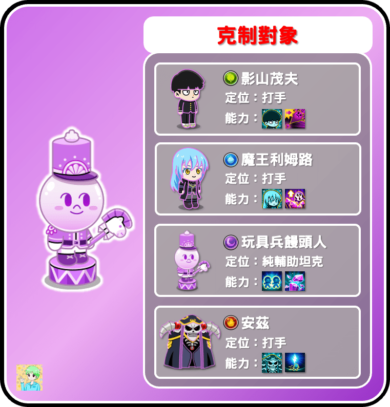 礙於闇黑玩具兵饅頭人是純輔助坦克,因此並沒有特別針對的角色,以上就根據其屬性及定位,列舉了幾隻常見的三元素打手,眾所皆知水火木打光闇的傷害都是原傷,加上饅頭人的體力其實也算偏高,因此非剋屬的角色不容易打倒闇黑玩具兵饅頭人;除了三元素打手外,還有其他「不會攻擊技能」的角色也算是克制對象,畢竟雙方都打不動對方,會讓對戰變成一個無限循環。