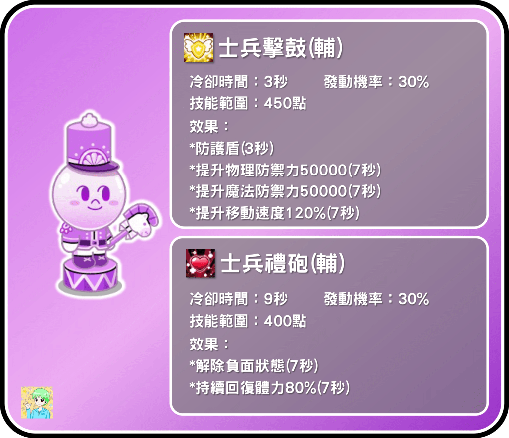 玩具兵饅頭人的二技能也是輔助技能,然而這項技能是真的完全沒變化,跟原先的樂隊饅頭人一樣都是解除負面7秒跟持續回覆體力80% 7秒,實在是讓玩家們有點失望。