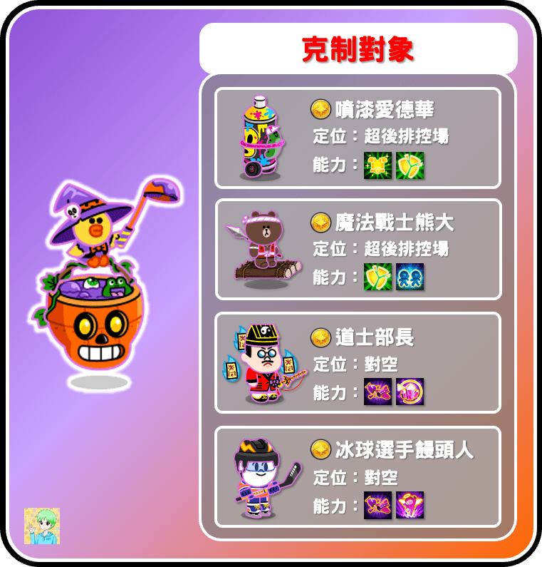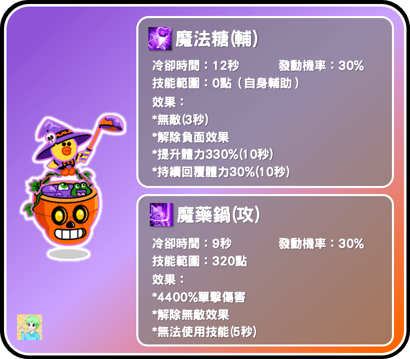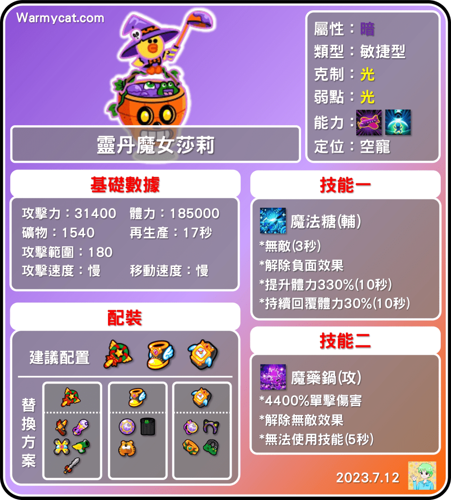 魔女莎莉的各數值都相當強勢,尤其是自帶30%技能抗性,讓他在戰場有超群的發揮,唯一缺點就是身為光暗寵的他,若要灌滿需要使用較為稀有的紫蛙,因此比較適合中後期的玩家來使用,新手玩家還是建議先留140等即可喔。