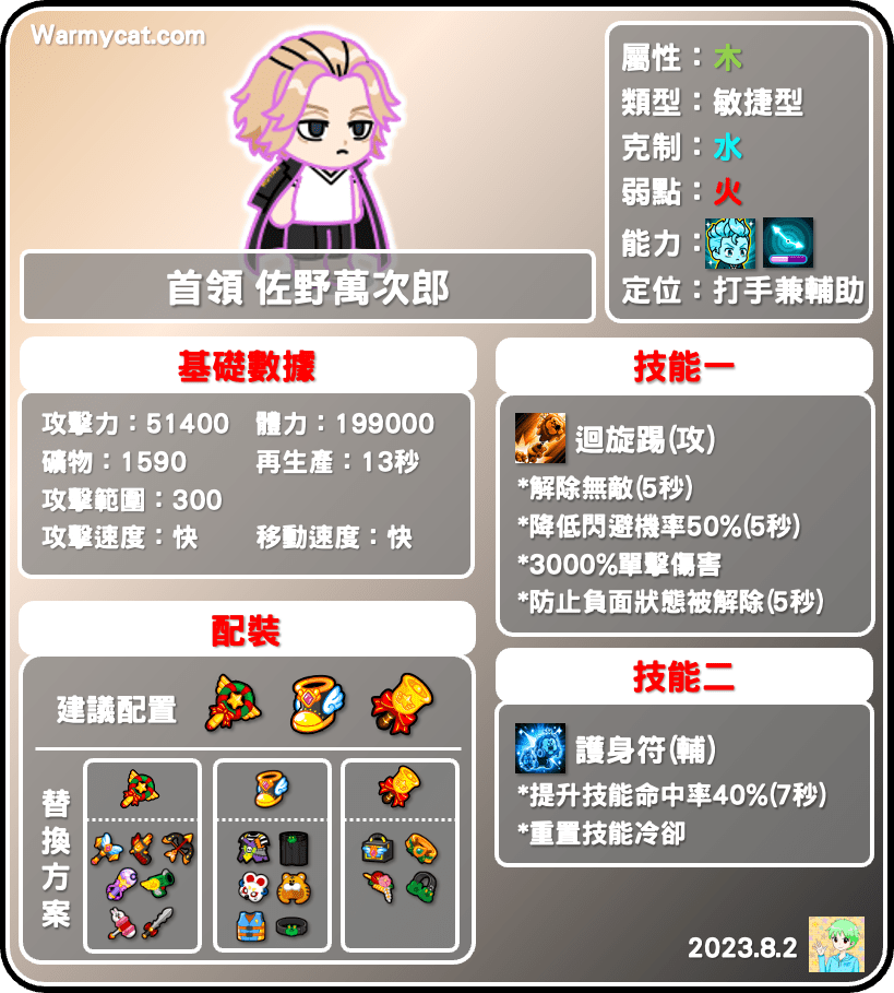 佐野萬次郎是木屬敏捷型,定位是打手兼輔助,基礎傷害高達5.1萬,為敏捷型第二高的角色,體力也接近20萬,為敏捷型第三,是個具有高輸出高坦度的敏捷型角色,站位300點看似不遠,但卻是重置角色中站位最好的,礦物量1590偏高,需要減礦裝備扶持,第二能力是暫停敵人出動,是時隔八個月後第三隻自帶停產,且可九星的合作寵,數據及能力上是相當的強勢。