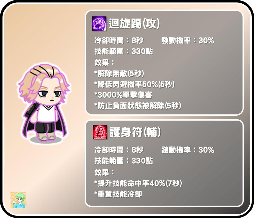 佐野萬次郎的出現可以說是各方的突破,重置寵站位的突破、敏捷型扭蛋寵傷害的突破,加上他又擁有目前最熱門的停產能力,在PvP中一定具有影響力,他非常適合沒有重置寵或缺少停產角色的玩家來使用,強烈推薦玩家等單獨加倍時嘗試抽抽看喔!