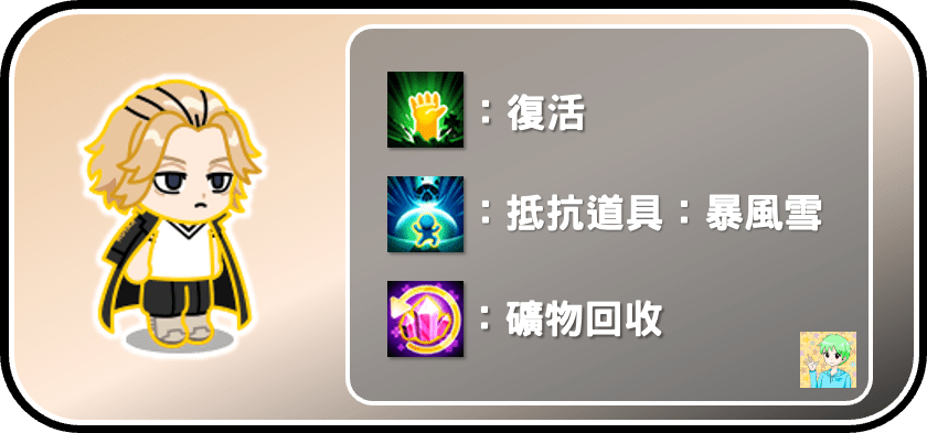 佐野萬次郎可以九星進化,並且進化後可以獲得以上三種能力中的一項,其中最推薦的能力是復活,站位不算遠的他容易被擊倒,復活就可以大幅提升他的存活時間,此外公會戰中,復活也是很強勢的能力,是個各場合都適用的能力。第二推薦的則是抵抗暴風雪,這個能力可以為我方抵擋風冰莎,有利於保護我方戰線。最後則是礦物回收,但佐野萬次郎的礦物回收效益會相較其他打手好些,因為他站位進,所以相對容易觸發能力。