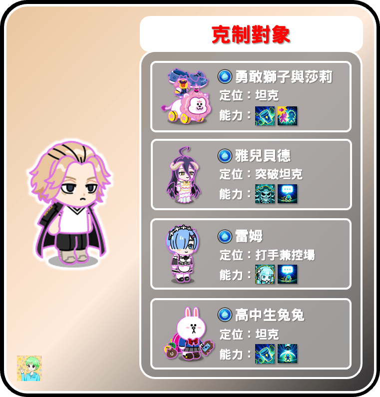 身為高傷害的木屬性打手,打水系角色跟吃飯一樣簡單,以上列舉了幾個近期或常見的水系角色,首先敏捷寵適合打物理防禦低的力量寵,因此佐野萬次郎可以輕鬆對付水系坦克,例如獅子車莎莉、雅兒貝德及高中生兔兔,當然他也可以壓制站位不遠的水打手,例如雷姆,是個各個段位都很適用的角色。
