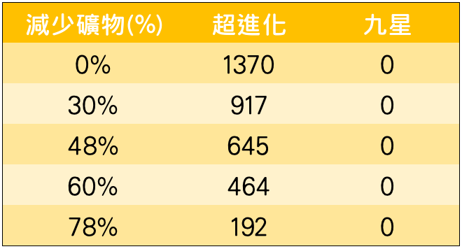 下表是為各種減礦時的礦物量(寶物全滿、無月間加成):