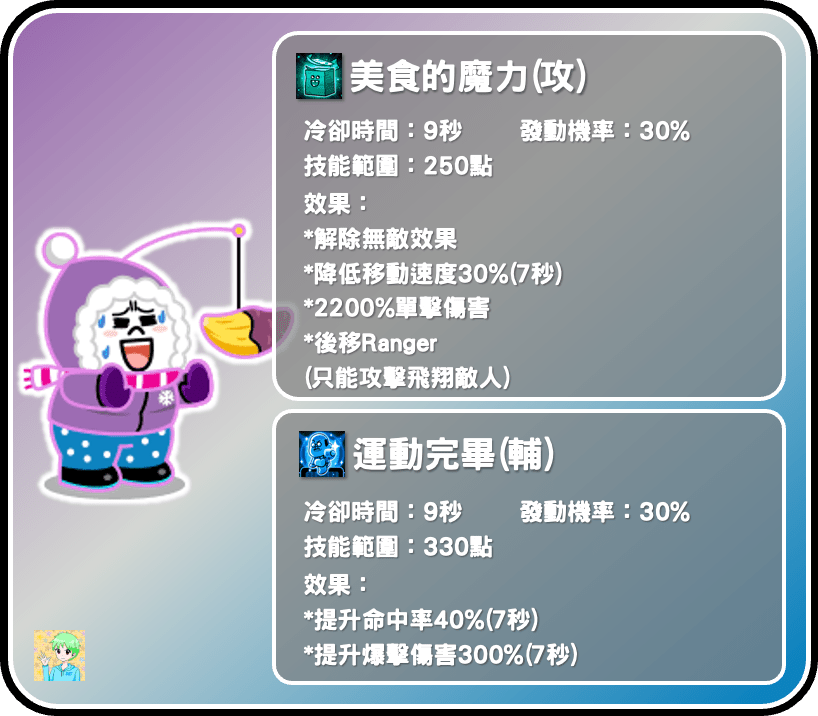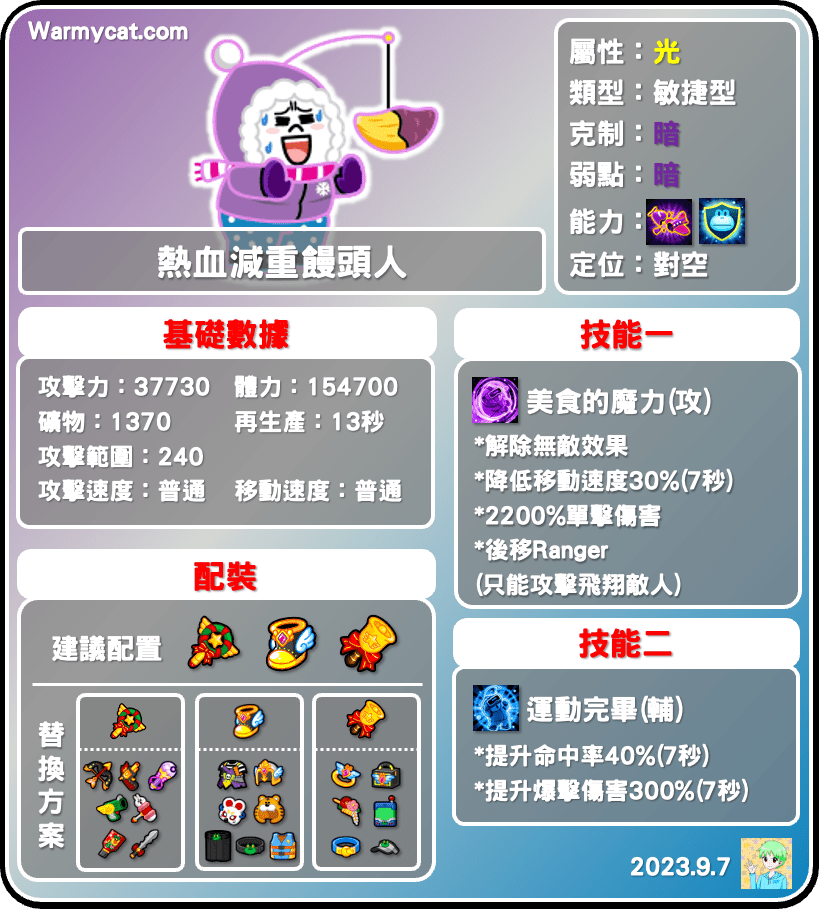 熱血減重饅頭人是光屬性敏捷型,定位是對空角色,也是第一隻九星的對空寵。攻擊力3.77萬還算可以,是敏捷型第26名,對空第三名,體力15.4萬也是中規中矩,還算可以接受。礦物量1370不算太高,比相似對空寵-騎士莎莉還低上不少,不過站位240偏近,可能得在空寵壓塔時才會好發揮,攻擊速度是普通,平民可以考慮搭配弓箭以提升攻擊速度。能力的部分是對空迎擊跟變身抗性,非常針對聖誕莎莉,不過目前也只有聖誕莎莉會變身,因此變身抗性對他來說幾乎是個沒用的能力。