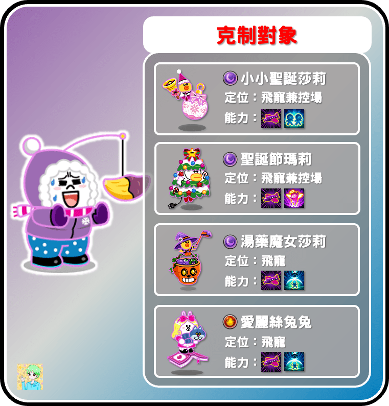 減重饅頭人是目前最強勢的對空寵,對空任何空軍都不會有問題,最針對的一定就是聖誕莎莉,其他對空都會被聖誕莎莉變身,導致對空效果不好,這是減重饅頭人的特別之處。再來就是其他的暗屬性空軍,通常使用普攻應該就可以攻下了。至於其他水火木空軍,若真打不下來也可以用技能來拖延時間,基本上把空軍拿捏的死死的。
