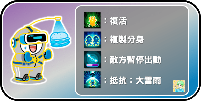 減重饅頭人有九星進化,而且他的四項能力都不算差,複製分身跟暫停敵方生產都是不錯的效果,看用途決定,如果是單純作為對空使用,可以使用複製分身,若想通時擁有對空與礙產,那麼暫停敵方生產會更好。再來則是復活,我是覺得空軍應該很難直接擊倒對空,因此復活這項能力不見得管用。最後是抵抗大雷雨,老樣子就是拿來搞事的,有點讓人煩躁的能力。