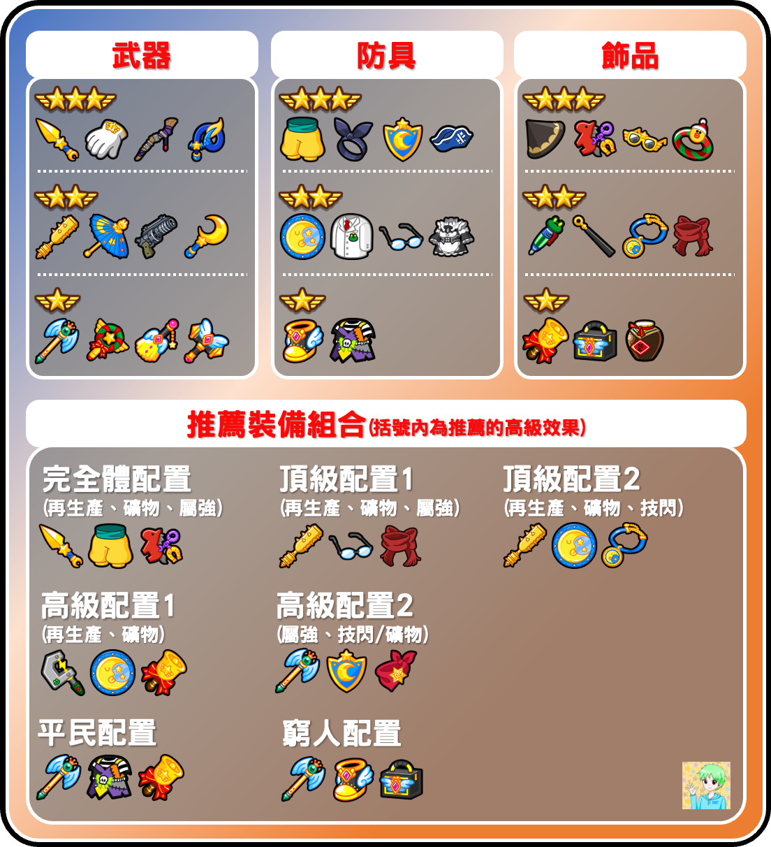 武器建議選用「攻擊減產必中」,例如新年系列的「新年青龍鞭」、賞月系列的「月光沈寂匕首」,盡可能讓輸出最大化。平民武器則是「榮耀魔棒」,帶有減產的同時也具有一定的輸出。