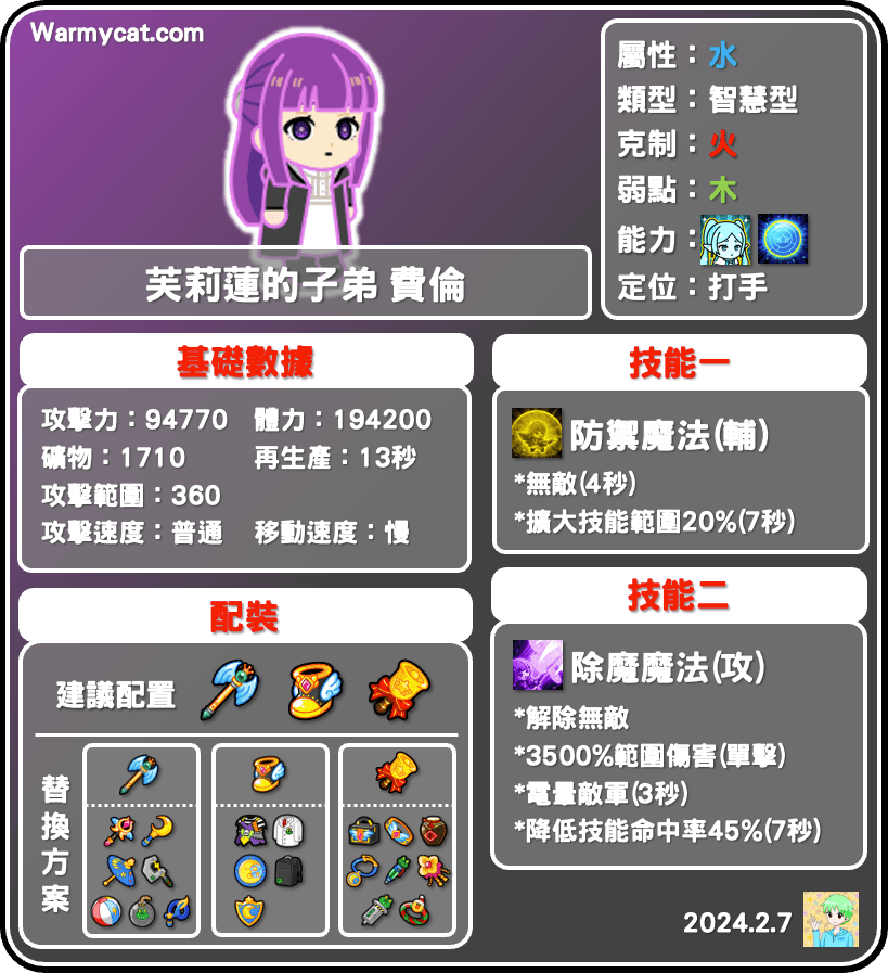 費倫是水屬性智慧型,擁有超高攻擊與體力,攻擊力高達9.4萬、體力也高達19.4萬,兩項數據都是智慧型前段班,基礎數據跟惠惠基本上有相同水準,站位也有360點,存活力不會太差,能力是新的「技能防護盾」,可以為我方抵擋一次「單擊技能傷害」,抵擋後護盾消失,三秒後會再生,目前看起來如果配合百閃裝備,應該會是個還不錯的能力,可以讓費倫有很強的生存力。