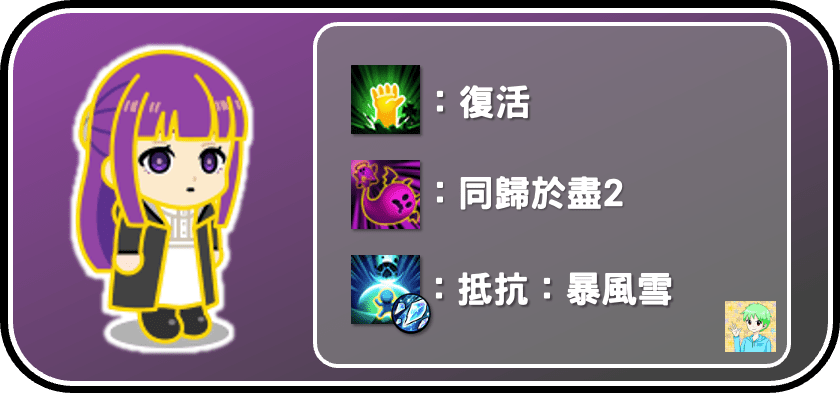 費倫九星進化後,可以從以上三種能力中隨機獲得一項,最為推薦的會是「抵抗暴風雪」,相較於其他角色,會比較推薦暴風雪的原因是因為費倫的站位偏遠,加上擁有新能力「技能防護盾」,本身就不容易死亡,所以復活也不容易觸發,所以「復活」才會是第二順位選擇,但不用刻意洗出抵抗暴風雪。「同歸於盡2」不是很推薦,原因同復活。