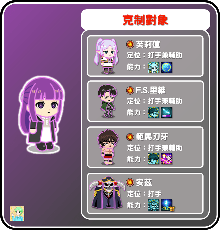 費倫是近期頗暴力的水系打手,不過他不是打後排的打手,所以基本上不能打站位過遠的角色,不過由於自身可以提高技能範圍,因此是可以打到本月的火打「芙莉蓮」,因此也可以打到其他火打,例如圖中的里維、刃牙或安茲,當然沒在圖中的傑克、鐵火卷莎莉也可以被費倫輕鬆壓制。