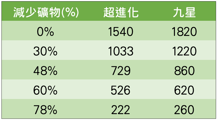 下表是為各種減礦時的礦物量(寶物全滿、無月間加成):