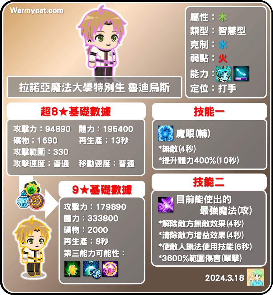 魯迪烏斯是木屬性智慧型,超進化時的攻擊力高達9.4萬、體力高達19.5萬,九星的攻擊力更是逼近18萬,是個實實在在的智慧型暴力打手,遠遠超越之前的最痛木打「影山茂夫」,成為木打第一輸出,在優秀的基礎數據下,礦物量也就會相對高一點,魯迪的礦物是1690,加上站位只有330點偏短,非常考驗裝備庫的強度,沒有一兩件強勢裝基本上是很難上場的。能力除了小隊以外,還有暫停敵方生產,是一隻極有可能穩傳奇的百大寵。