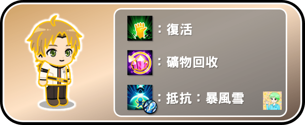 魯迪九星進化後,可以從以上三種能力中隨機獲得一項,最推薦的是復活,因為魯迪的站位不高,容易被對手技能波及,復活有助於讓他在場上待更久,也就能有更穩定的輸出!抵抗暴風雪則適用於PvP突襲,有機會抵擋對手的風冰莎,也可以在暴風雪時輔助我方,以抵擋暴風雪的傷害。礦物回收則是用途較少,強度也不好,不推薦使用。