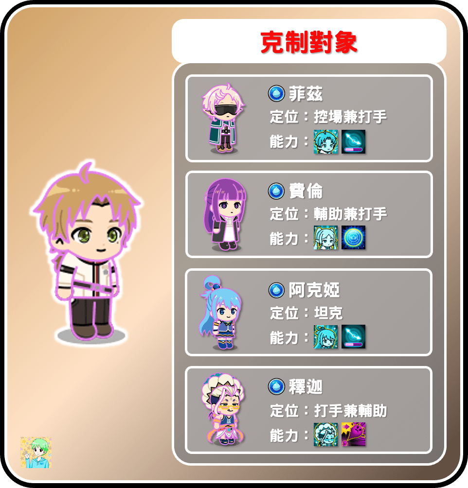 身為暴力木寵又能打後排的魯迪,理所當然能用來針對各種水系坦克跟後排打手,例如近期的水坦阿克婭及站位優異的費倫,都是魯迪的狩獵範圍內,當然中間站位的菲茲、釋迦也包含在內,更早期的利姆路也可以用魯迪克制,成為繼愛蜜後高輸出的後排木打。