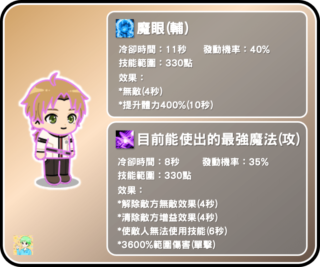 魯迪的一技能是輔助技能,可以給予我方無敵效果並提高體力,有趣的是倍體數據高達400%、時長長達10秒,算是很罕見且優異的數據組合,這項輔助技能可以稍微彌補魯迪站位短的缺點,能些微提高魯迪的生存力。