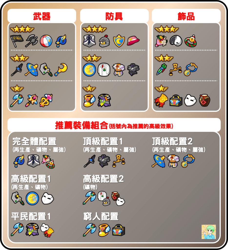 圖片上半部是推薦能使用的裝備,其中屬性裝備除了八星防具的「9.5週年頭盔」外,其餘皆為合作裝備,目前適用的減產必中有新年青龍鞭及傲慢水龍王(七星武器第一個)。下半部也有推薦一些裝備組合供各位參考,如果閃抗充足的情況下,裝備的高級效果建議優先選擇減少礦物。