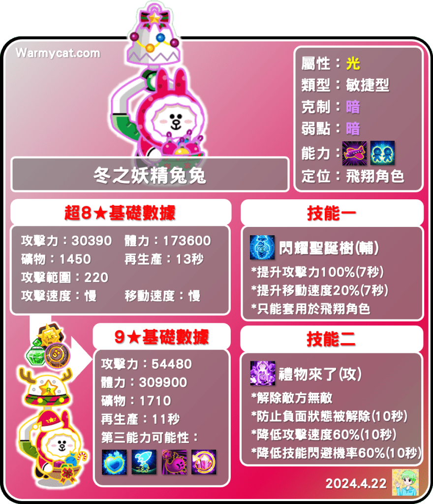 冬之妖精兔兔是光屬性敏捷型,超進化的傷害高達3萬,是飛翔角色中數一數二高的,體力17.3萬也是相當優異!礦物量1450也不算太高,是平民裝備即可撐起的一隻飛翔寵。進化九星之後攻擊力更是來到5.4萬,對於空軍來說是極高的數據,從數據就能感受到威脅性了,站位部分只有220,不算太遠,但對於飛寵來說影響不會太大,只有多少影響到摸塔快慢而已,能力部分除了飛行以外,還有一項複製分身,偶爾可以一次出兩隻,提高對塔的殺傷力,是一項不無小補的能力。