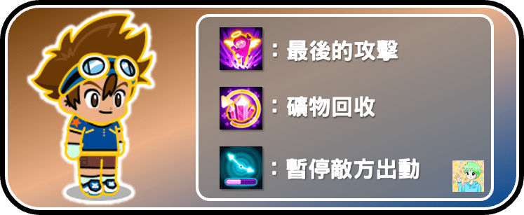 八神太一九星進化後,可以從以上三種能力中隨機獲得一項,最推薦的能力是暫停敵方出動,可以讓太一成為停產的一員,如果是玩礙礦的玩家則可以考慮最後的攻擊,至於礦物回收效果則相對普通。
