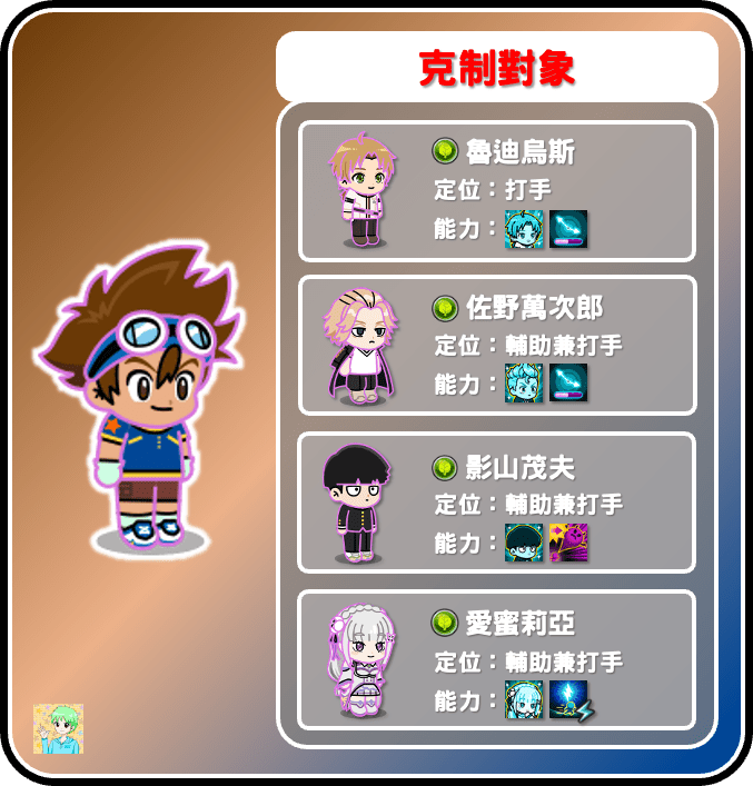 八神太一的登場,可以克制無職2合作的魯迪烏斯,只不過近期的熱門木寵其實也不算多,因此太一的用途可能就沒這麼廣泛,但靠著大範圍技能,還是可以牽制一些後排打手,例如主唱熊大、惠惠、死靈法師潔西卡,至於明不明顯就因人裝備而異啦。