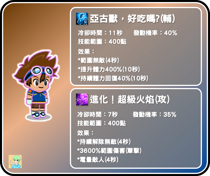 八神太一感覺又是一個官方的實驗品,也是首批將停產作為九星能力的合作寵,不推薦黃金~大師底的玩家將其作為停產寵的優先選擇,畢竟160等的生產速度也不算太快,但如果九星蛙氾濫,就可以嘗試看看八神太一喔。