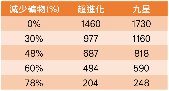 下表是為各種減礦時的礦物量(寶物全滿、無月間加成):
