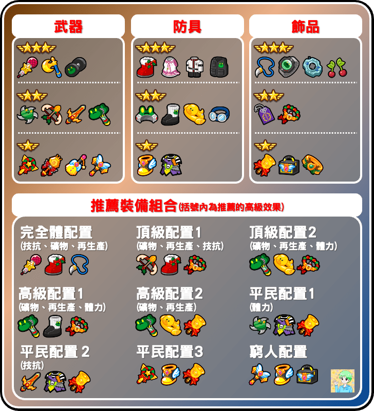 圖片上半部是推薦能使用的裝備,其中推薦的屬性裝備皆為合作裝備,目前適用的減產必中有八星的10週年麥克風及七星的聖誕冬青聖弓,第四項優先建議選擇減少礦物。