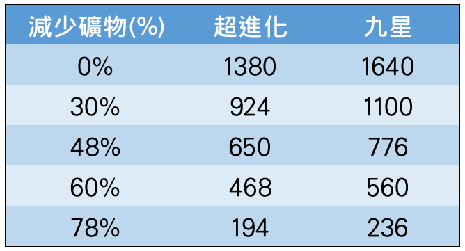 下表是為各種減礦時的礦物量(寶物全滿、無月間加成):