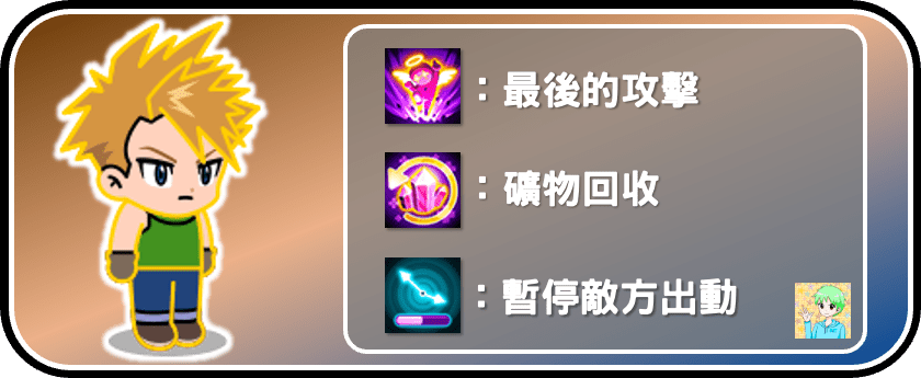 石田大和九星進化後,可以從以上三種能力中隨機獲得一項,最推薦的能力是暫停敵方出動,可以讓太一成為停產的一員,如果是玩礙礦的玩家則可以考慮最後的攻擊,至於礦物回收效果則相對普通。