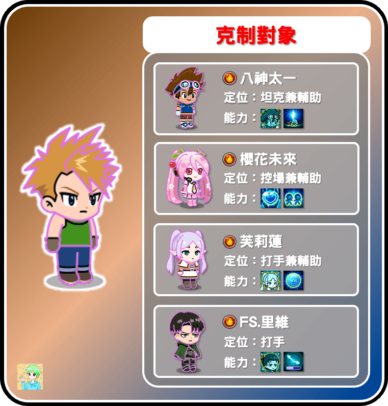 身為水系,克制火系合情合理,例如本月大獎八神太一,以及站位較短的櫻花未來、FS里維,這幾隻都屬於大和的克制範圍之內。芙莉蓮雖然站位390點,已經超過的大和的技能範圍,但由於近期坦克鮮少有低於50點的,因此技能還是高機率能命中芙莉連,至於如果要克制惠惠,就需要依賴技能範圍擴大了。